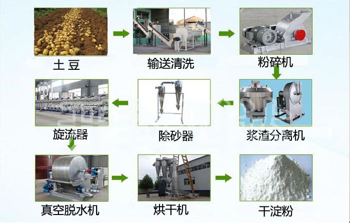 土豆→(清洗輸送機)→清洗(清洗轉(zhuǎn)籠)→粉碎(錘片式粉碎機或銼磨機)→漿渣分離(壓力曲篩或離心篩、漿渣分離園篩)→除砂(除砂器)→蛋白纖維分離(碟片分離機、濃縮凈化旋流器機組)→脫水(離心機或真空脫水機)→烘干(低溫低塔氣流對撞淀粉烘干機)→包裝入庫。