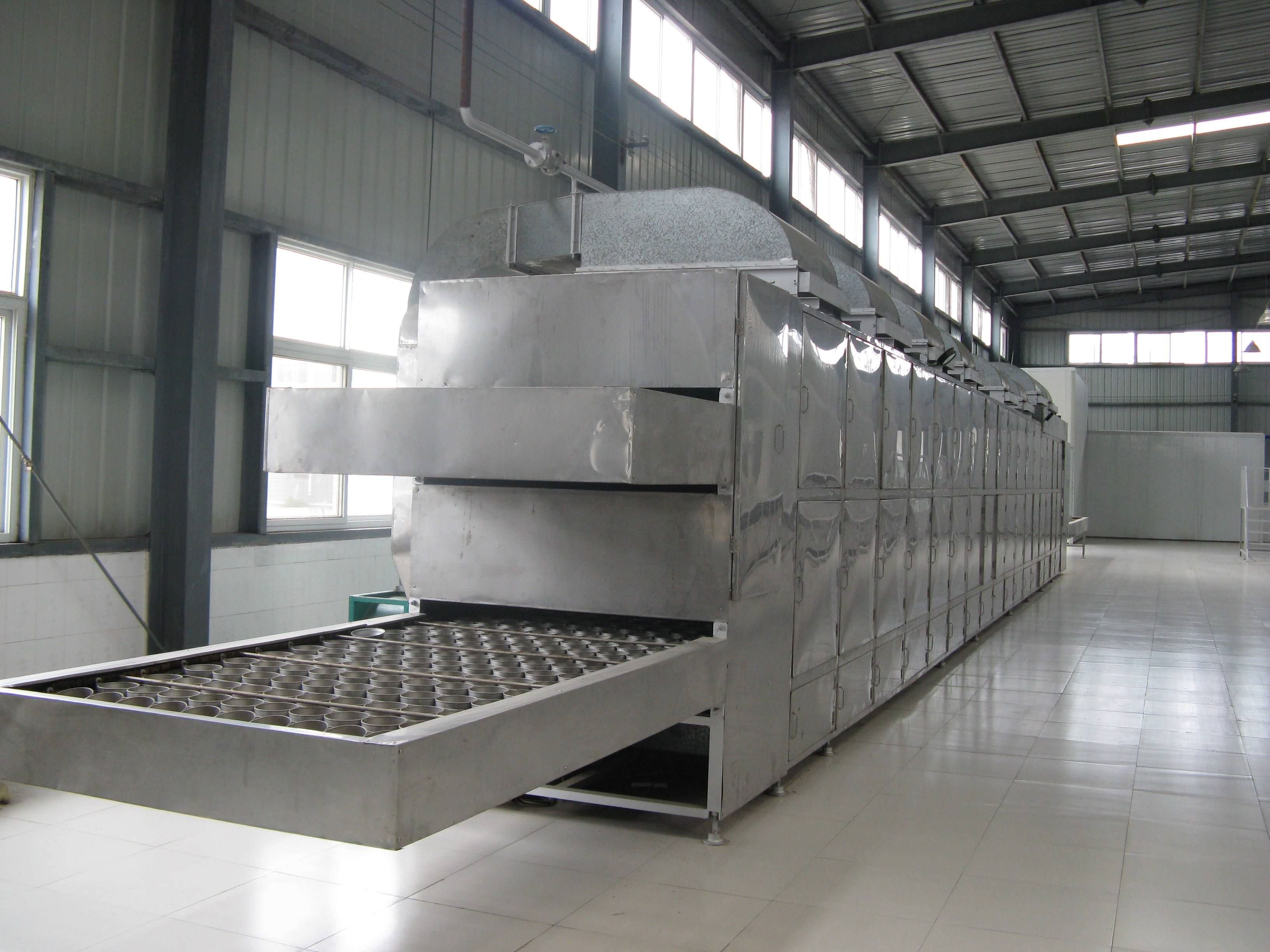 工藝流程:預熱→螺旋攪拌(恒溫儲料)→真空攪拌→刮板下料成型→蒸熟(蒸汽)→冷卻→脫離→常溫老化→低溫老化(冷庫)→豎切絲→定量稱重-→裝碗→自動成型→連續性干燥→除潮→涼化→成品包裝。