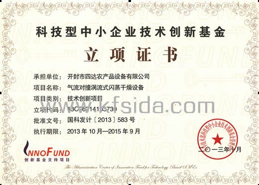 氣流對撞渦流式閃蒸干燥機申請的國家總小企業基金正式立項,并頒發了立項。
